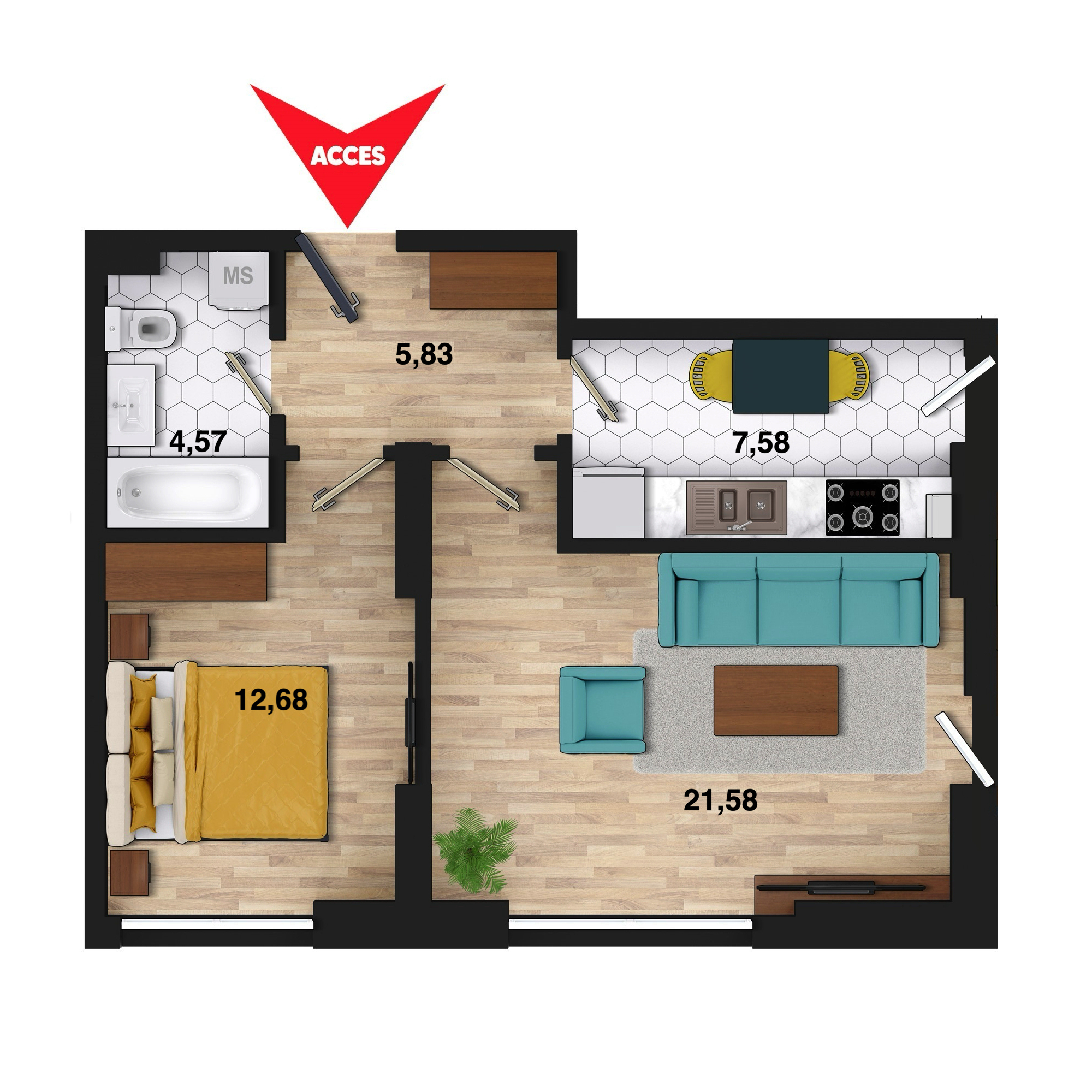 Apartamentul este perfect decomandat si este eficient compartimentat, neavand holul exagerat de mare sau alte spatii inutilizabile, bucataria este inchisa cu loc de luat masa iar distribuția către camerele de locuit se face din holul comun. Apartamentul nu are balcon.